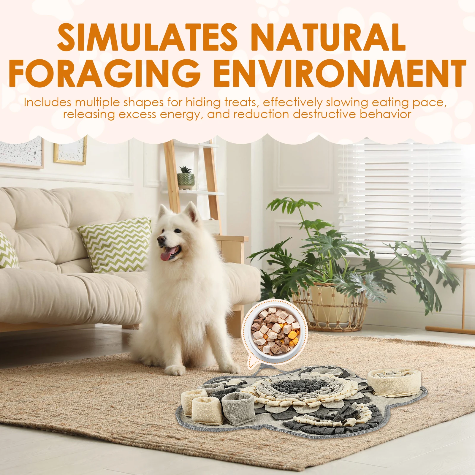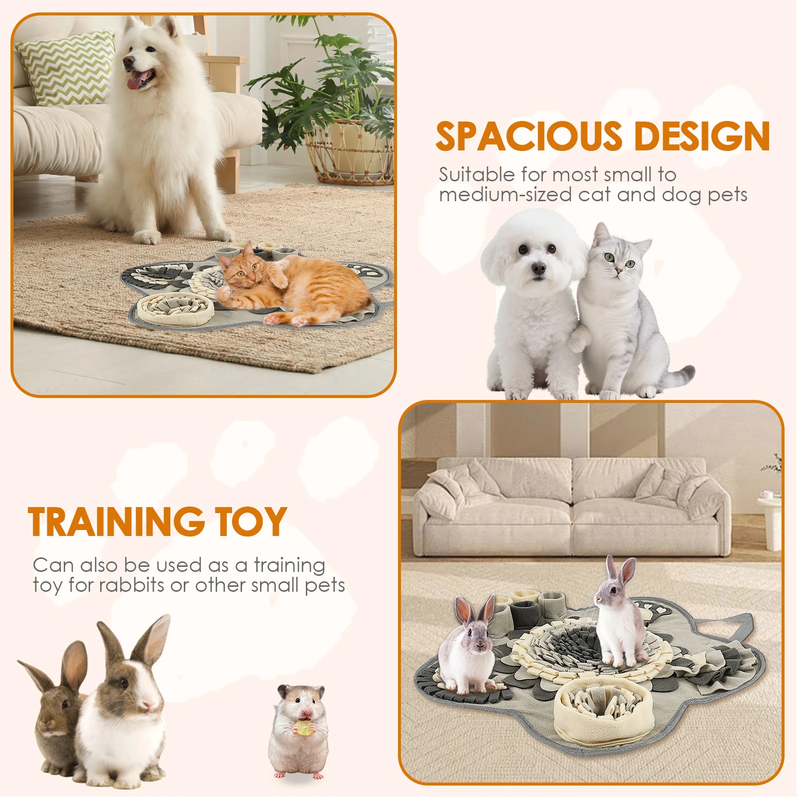 Practical : The sniffing mat includes various shapes to hide food , simulating a natural foraging environment for pets . It effectively slows down the eating speed . While satisfying pets' needs , it can relieve their stress , release excess energy , and avoid destructive behaviors